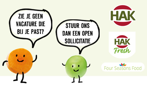Bij HAK, HAK Fresh en Four Seasons Food werken we samen aan onze missie om zoveel mogelijk mensen te helpen meer groenten en peulvruchten te eten op ieder moment van de dag. We weten dat we elkaar nodig hebben. Daarom doen we het écht samen. Iedere collega en elke stap van het proces zijn even belangrijk. Van het zaadje dat de grond in gaat, tot het maken van de lekkerste groente die uiteindelijk bij de consument op het bord ligt. Iedereen levert zijn bijdrage aan een prachtig product waar we supertrots op zijn; goed voor de gezondheid en de planeet!